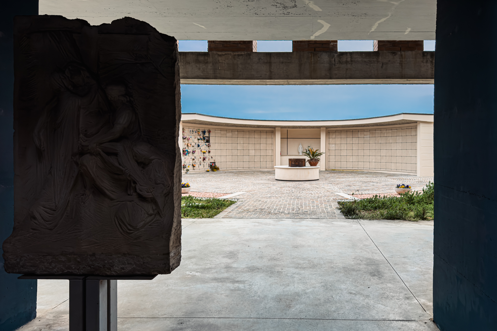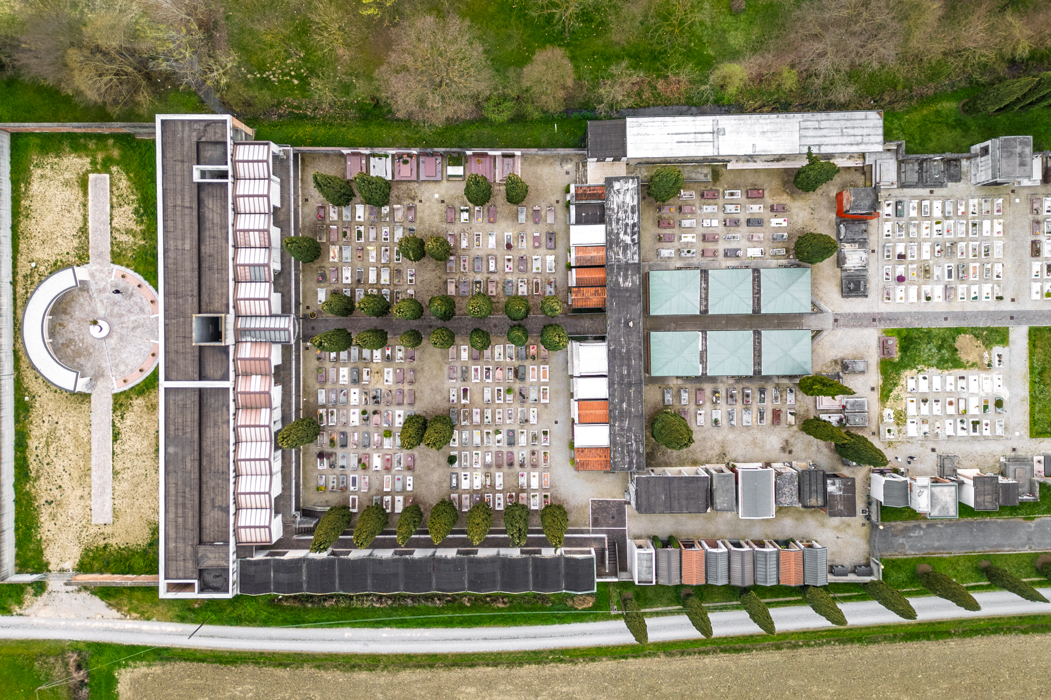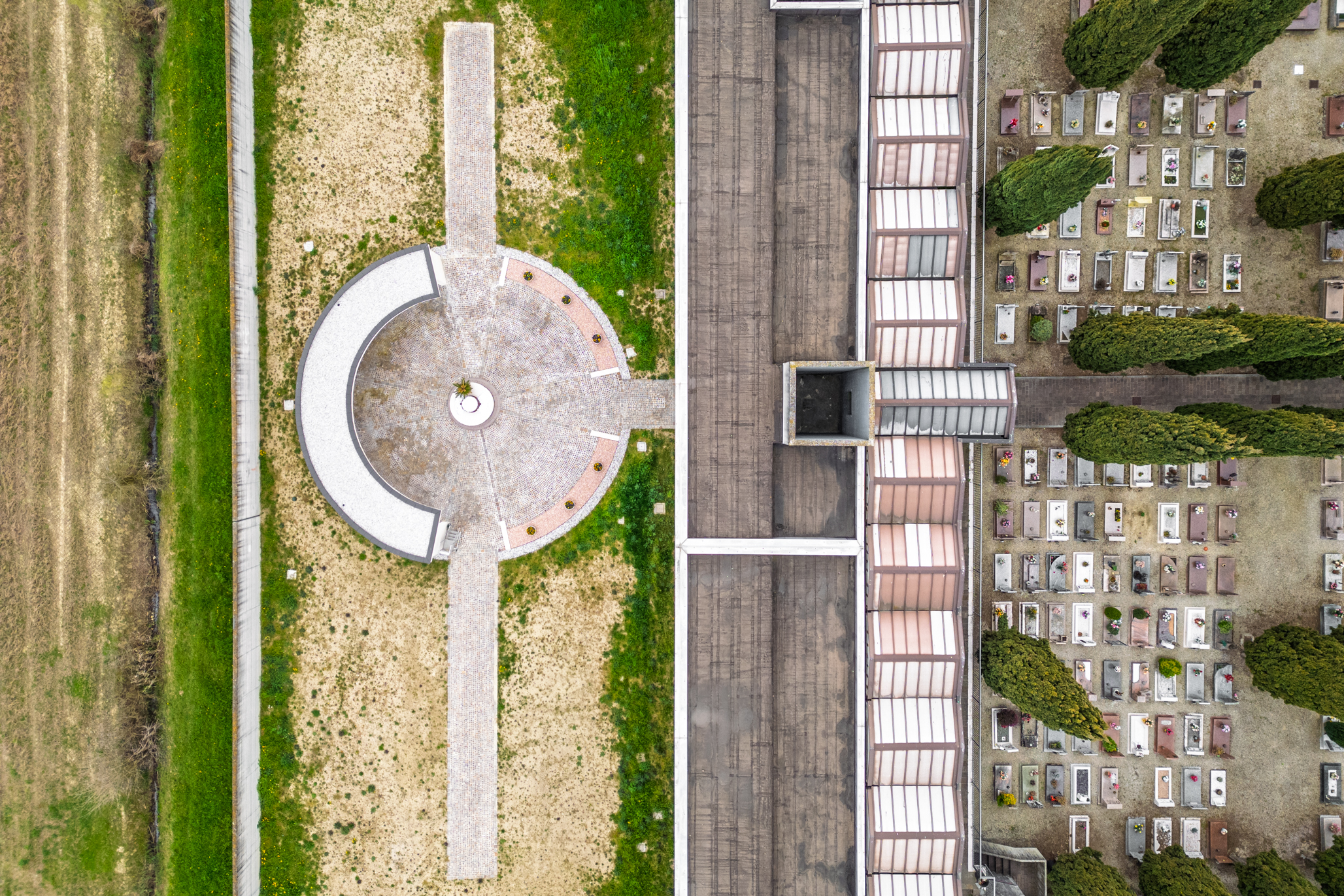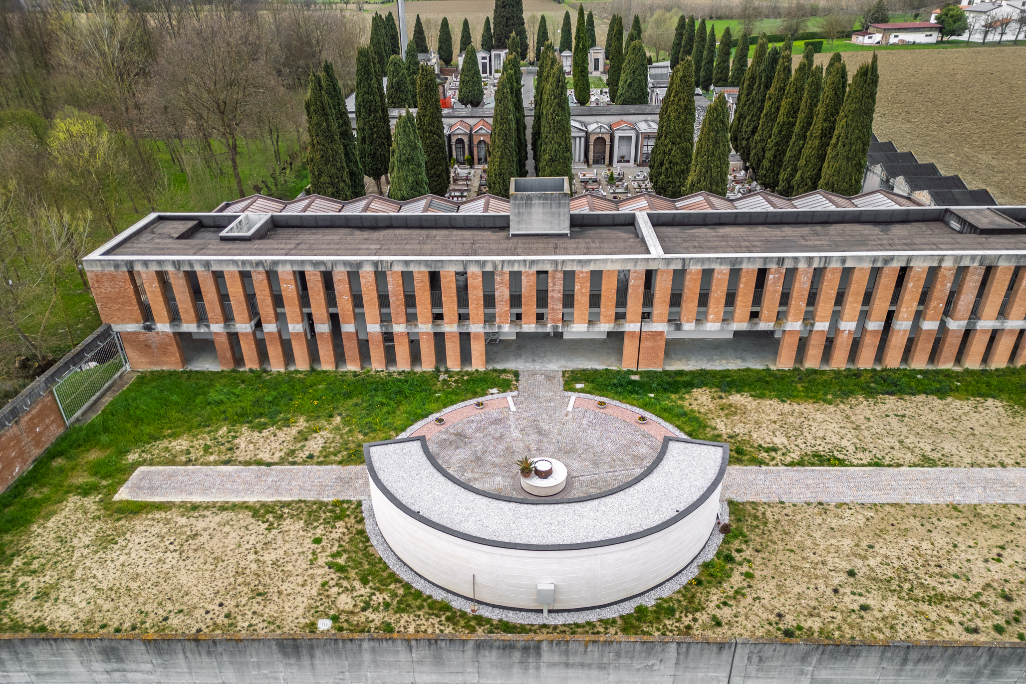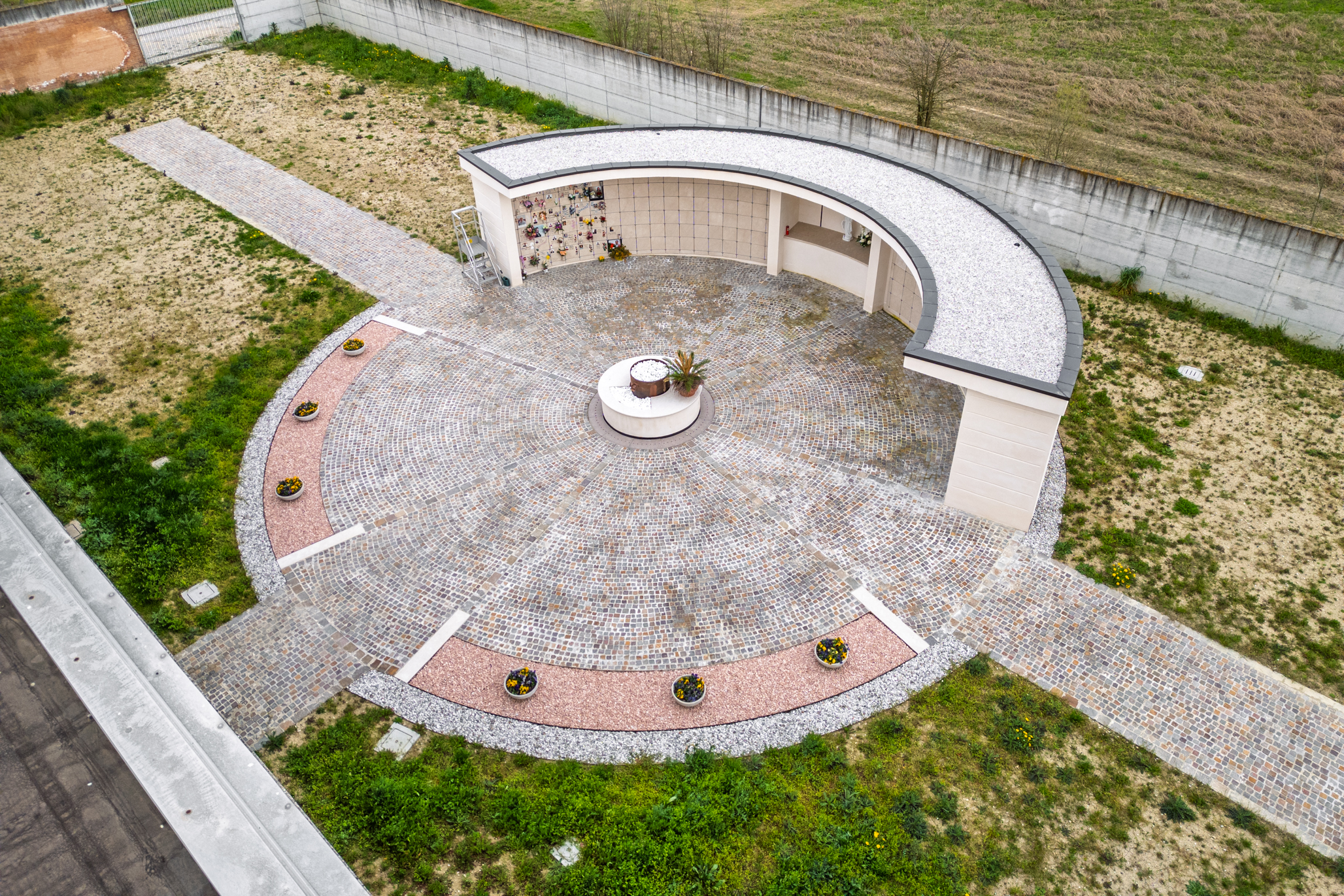 L’intervento consiste in un manufatto semicircolare che ospita 204 nicchie cinerarie, affiancato da un corpo centrale destinato alla dispersione delle ceneri e da una cappellina con altare votivo pensata per la commemorazione dei defunti. Il progetto include inoltre la predisposizione di spazi per future cappelline di famiglia e tombe alla romana, ampliando così le possibilità di sepoltura all’interno del complesso cimiteriale.